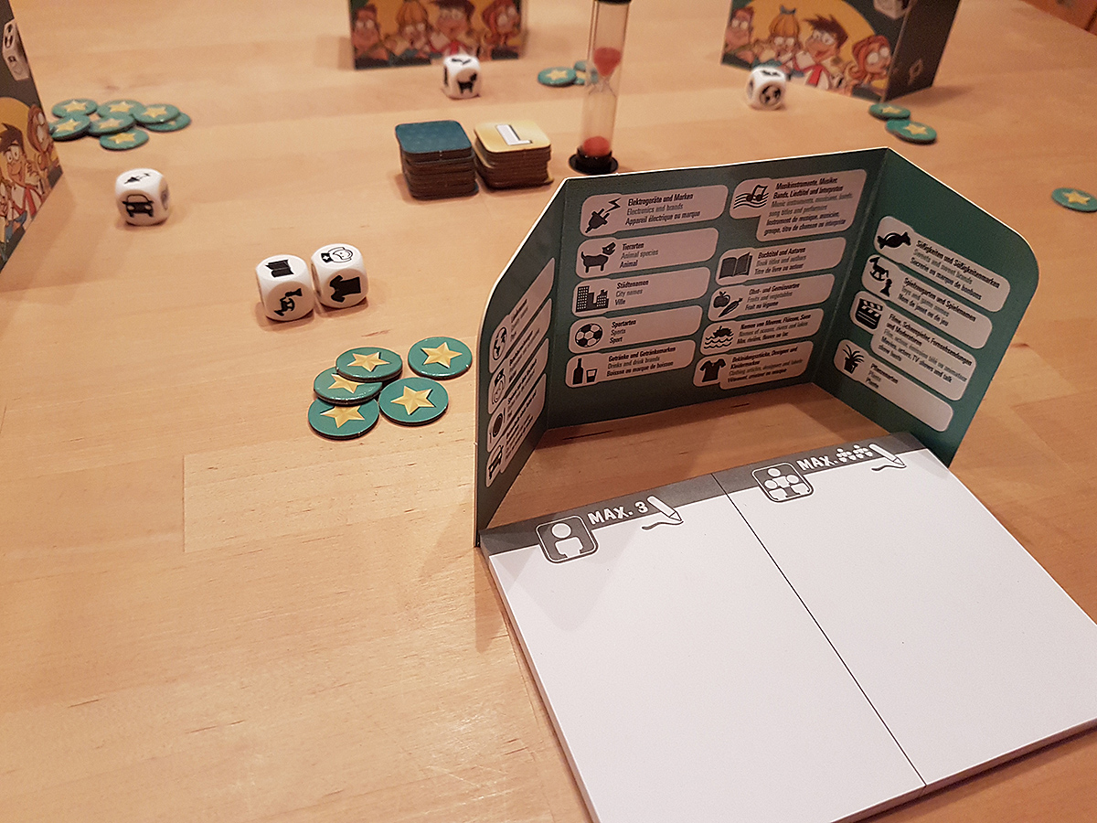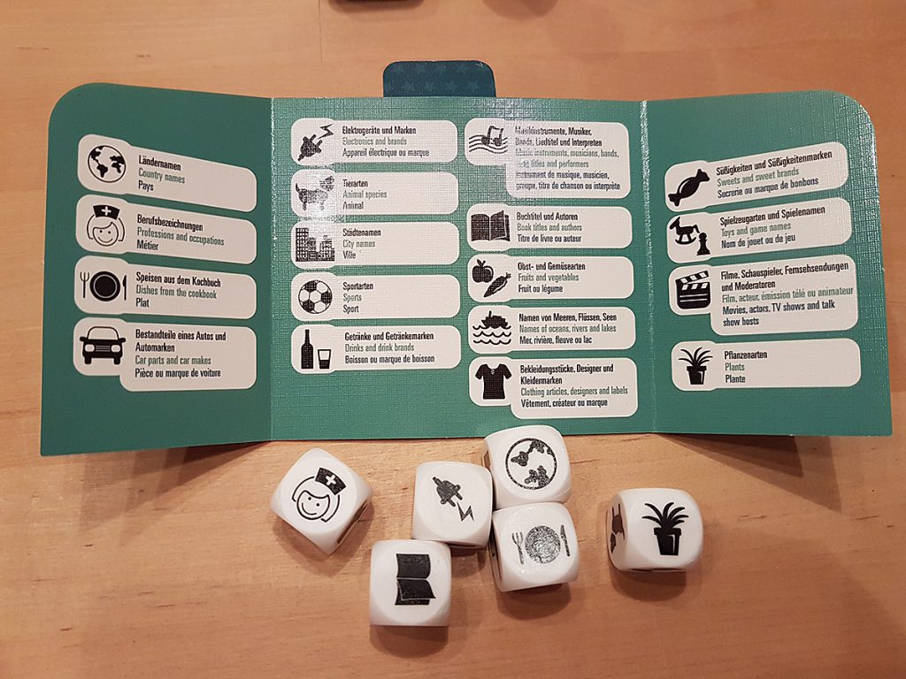 „Stadt – Land – Fluss“ einmal etwas anders. Zum einen hat man nur ein Thema, zu dem man Begriffe suchen muss (abhängig vom Würfelwurf). Zum anderen kann man den Mitspieler schon mal ärgern. Als Themen stehen Speisen, Sportarten, Autoteile, Getränke, Spiele (!), Bücher und so weiter zur Verfügung, also genug Abwechslung für viele Runden.
