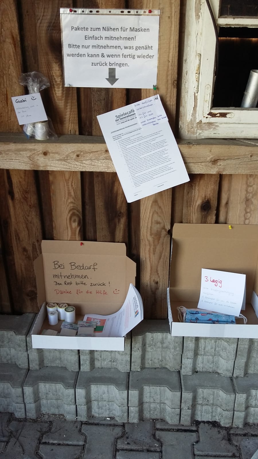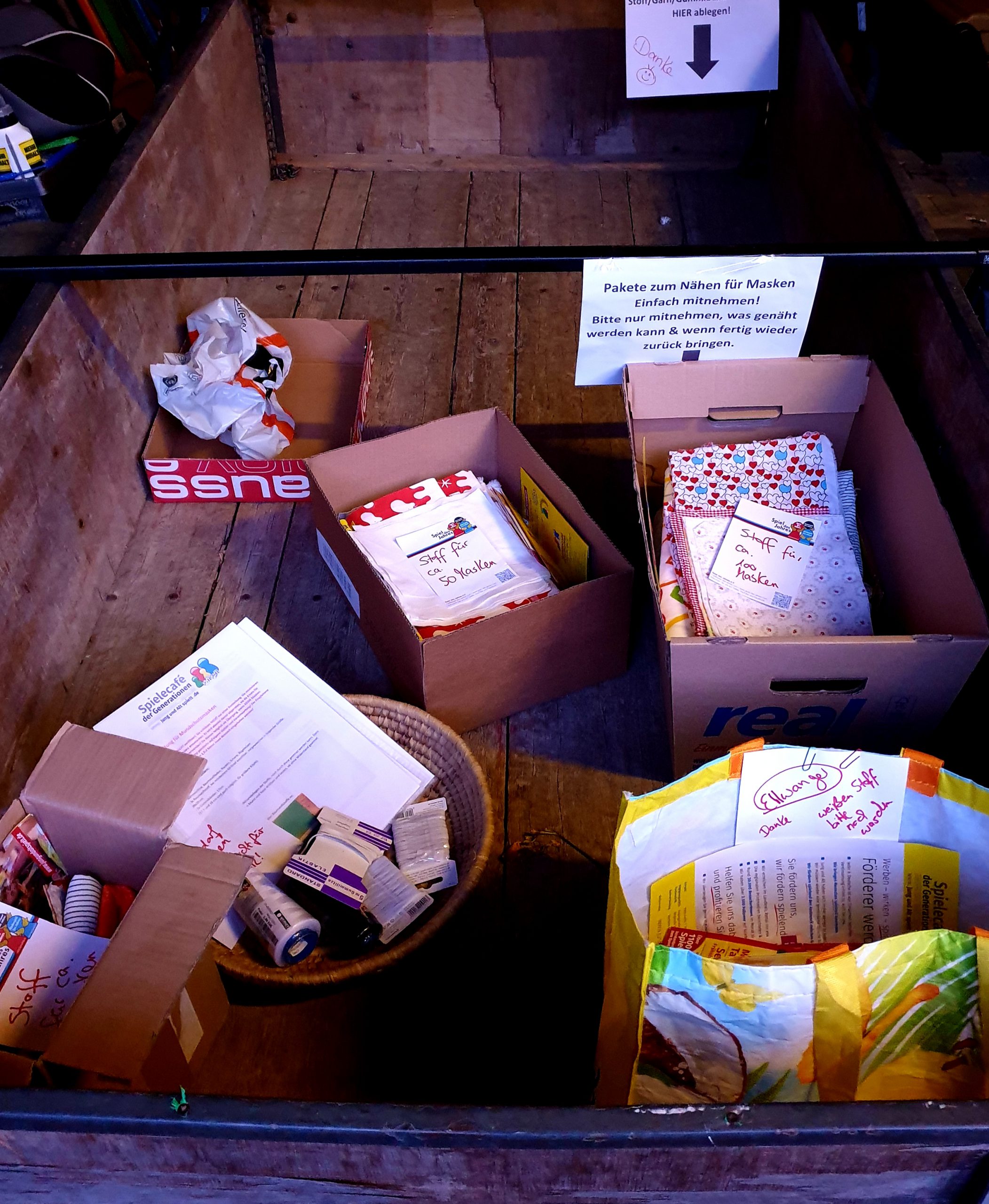 ACHTUNG: Die Verteilerstationen öffnen nun auch für die Ausgabe: Ab Heute 17 Uhr. Bitte VORHER absprechen, wenn Ihr Stoffe zum Nähen abholen wollt, damit auch genug vorbereitet ist. Spenden und fertige Masken können immer ohne Absprache und ab sofort abgestellt werden.