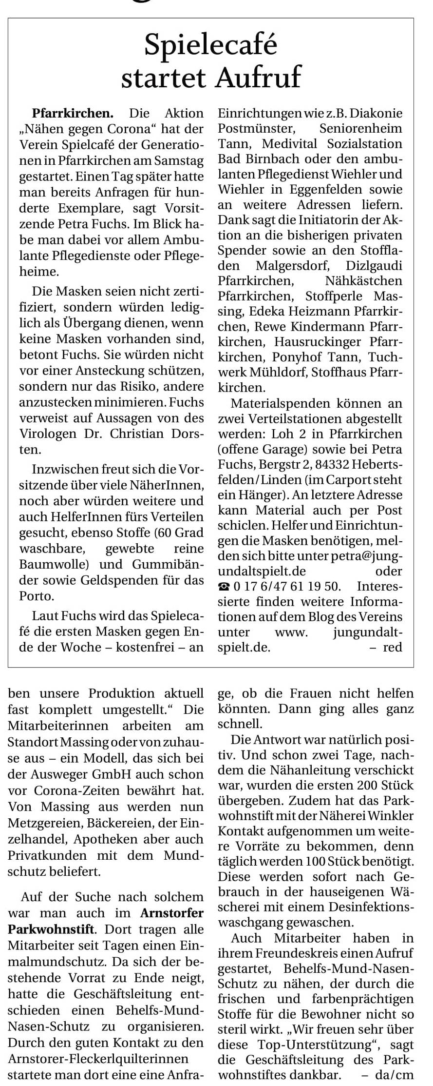 Die ersten Initiativen wurden heute und gestern Abend mit Masken beliefert. Und die Masken kommen gut an. Hier ein tolles Foto des Pflegedienstes Wiehler & Wiehler aus Eggenfelden. So lässt sich arbeiten