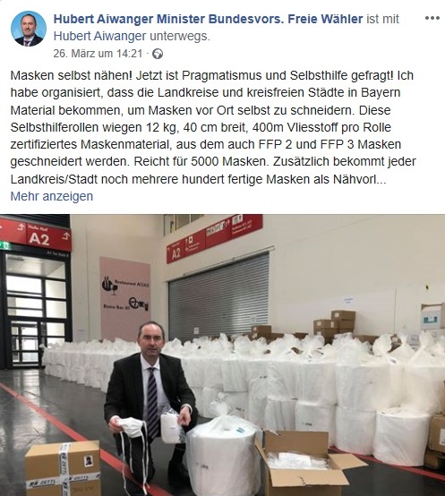 Unser Wirtschaftsminister Herr Aiwanger hat nun auch professionelles Masken-Material organisieren können, welches auf die Landkreise verteilt wurde. Diese Stoffrollen – vom THW verteilt – gingen in erster Linie an Schneidereien, im Landkreis Rottal-Inn z. B. an die Firma Aumer Berufsbekleidung, wo zertifizierte Schutzmasken produziert werden. Herr Aiwanger hat unter dem Schlachtruf „An die Nähmaschinen wer nähen kann“ die Bürger zur Hilfe aufgerufen. Wir folgen diesem Ruf auch weiterhin, auch wenn wir uns mit alter Bettwäsche und normalem Baumwollstoff zu helfen wissen.