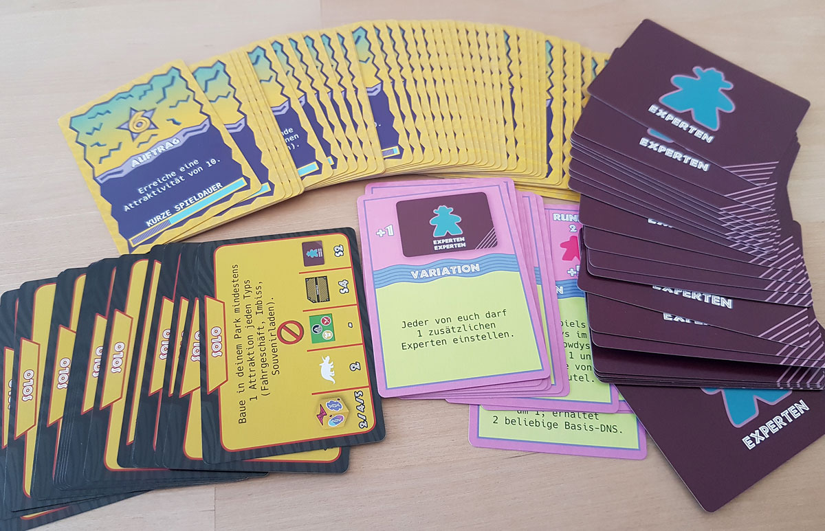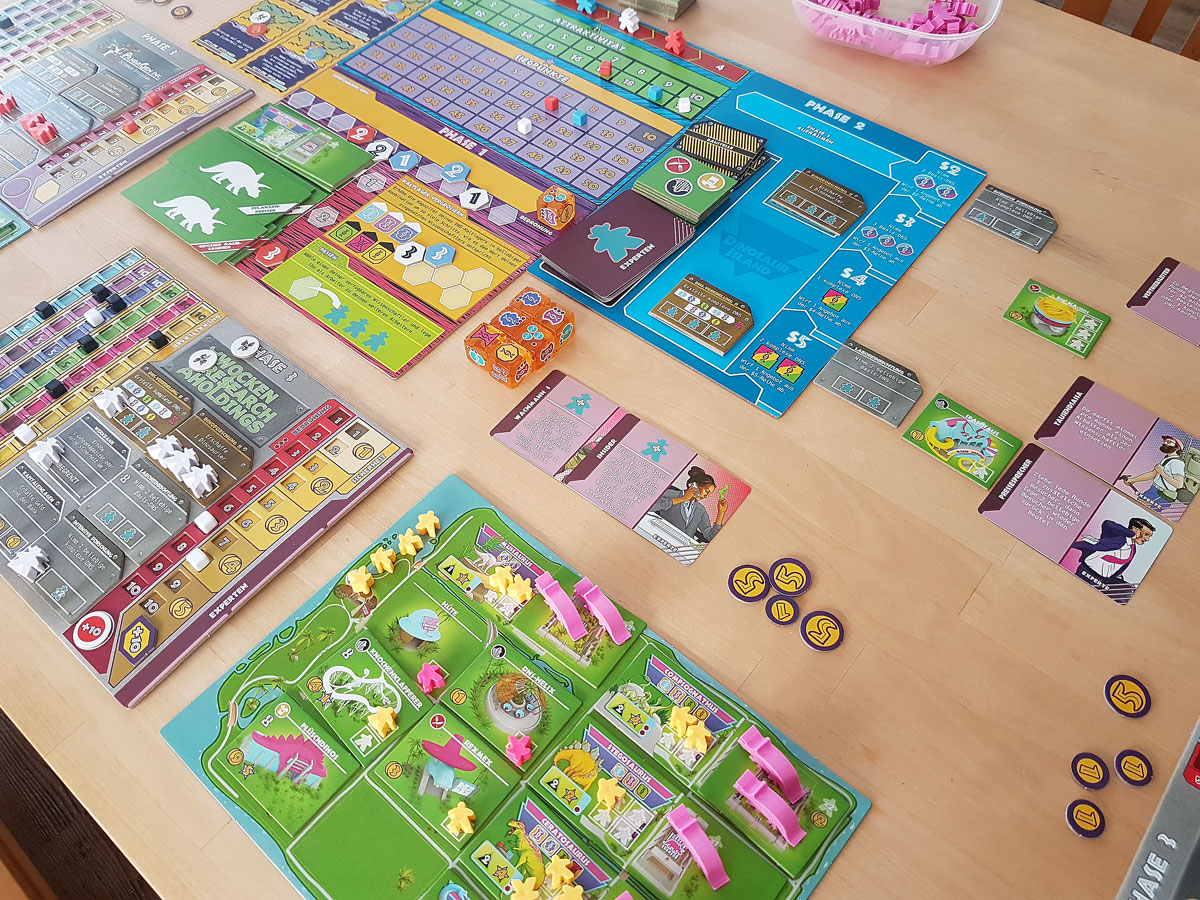 So sehr es verlockend ist, seinen Park auszubauen, Dinos aufzuziehen und die Attraktivität zu erhöhen, letztlich ist das Spiel ein knallhartes Wettrennen. Das darf man nicht aus den Augen verlieren. Das fordert und bestraft weniger gute Züge. Ein Fehler kann durchaus schon die Siegchancen kosten. Aber nicht nur ein Fehler. Manchmal liegt einfach nicht das Richtige aus, um es zu kaufen. Da schnappt sich der/die Mitspieler*in das benötigte Rezept weg, der Laborausbau ist vergeben, und so weiter. Man ist leider viel zu sehr davon abhängig , was durch Zufall ausliegt. Auch die Würfel zeigen nicht immer das, was man gerade bräuchte. Und beim Ziehen der Besucher*innen ist sowieso Glück dabei. Für ein Kennerspiel eindeutig zu viel. Dabei wäre das Spiel wegen der vielen Möglichkeiten und der Menge an unterschiedlichen Karten in diesem Bereich einzuordnen. Auch wenn es vom klaren Spielablauf und den eindeutigen Kartentexten sehr einfach zu spielen ist. Also mit etwas Spielerfahrung und ein bisschen Geduld, wenn die Auslagen genau angesehen werden, ist es auch problemlos als Familienspiel denkbar. Hier spielt der hohe Glücksanteil auch keine so große Rolle.