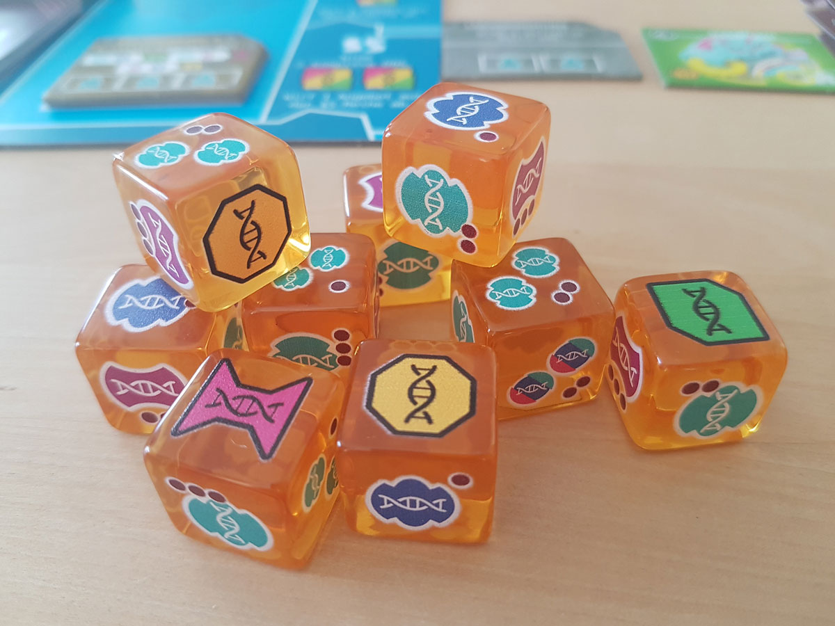 Eine Runde ist dabei in fünf Phasen aufgeteilt. Zuerst wird mit DNA-Würfel gewürfelt. Dann wählt man der Reihe nach Würfel aus, setzt einen Wissenschaftler darunter und erhält die entsprechenden Ressourcen, multipliziert mit dem Wert des Wissenschaftlers. Hier muss man klug abwägen, wie man seinen 1er, 2er und 3er einsetzt und vor allem wann. Du kannst aber auch die Kühlkammern für die DNA-Ressourcen erweitern, Dino-Rezepte besorgen oder passen. Rezepte braucht man, um mit der entsprechenden DNA Dinos für den Park zu erschaffen. Es liegen dabei drei Stück aus pro Runde und für jeden Wissenschaftler-Level genau eines. Wenn weg, dann weg. Das ist heftig.