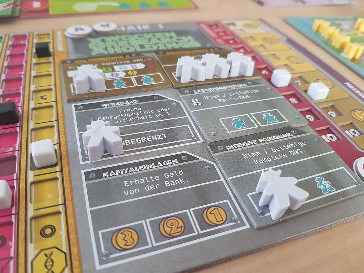 In der zweiten Phase hat man bis zu zwei Marktaktionen. Hier kann man Spezialisten mit Sonderfähigkeiten anheuern, Attraktionen bauen (wichtig für die Besucherströme), Laborerweiterungen oder DNA kaufen oder wieder passen.
