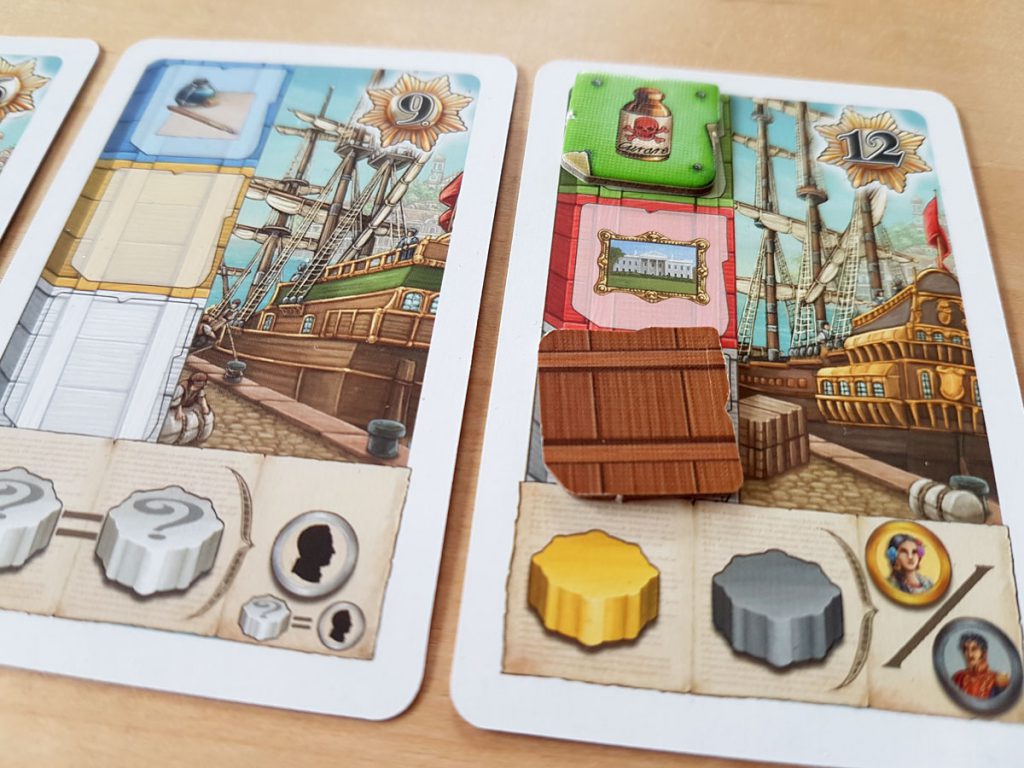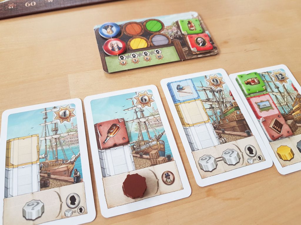 Und jetzt sind erstmal die anderen Mitspieler dran. So entsteht keine Langweile. Toll gelöst. Jeder darf sich nämlich jetzt einen Stein von einem der Orte nehmen und auf einen seiner Schiffskarten legen. Hat das jeder gemacht, darf ich mir für jede Stadt, auf die ich einen Stein in der Stadtfarbe gelegt habe, eine Kiste nehmen, die ich wiederum auf meine Schiffskarten legen darf.