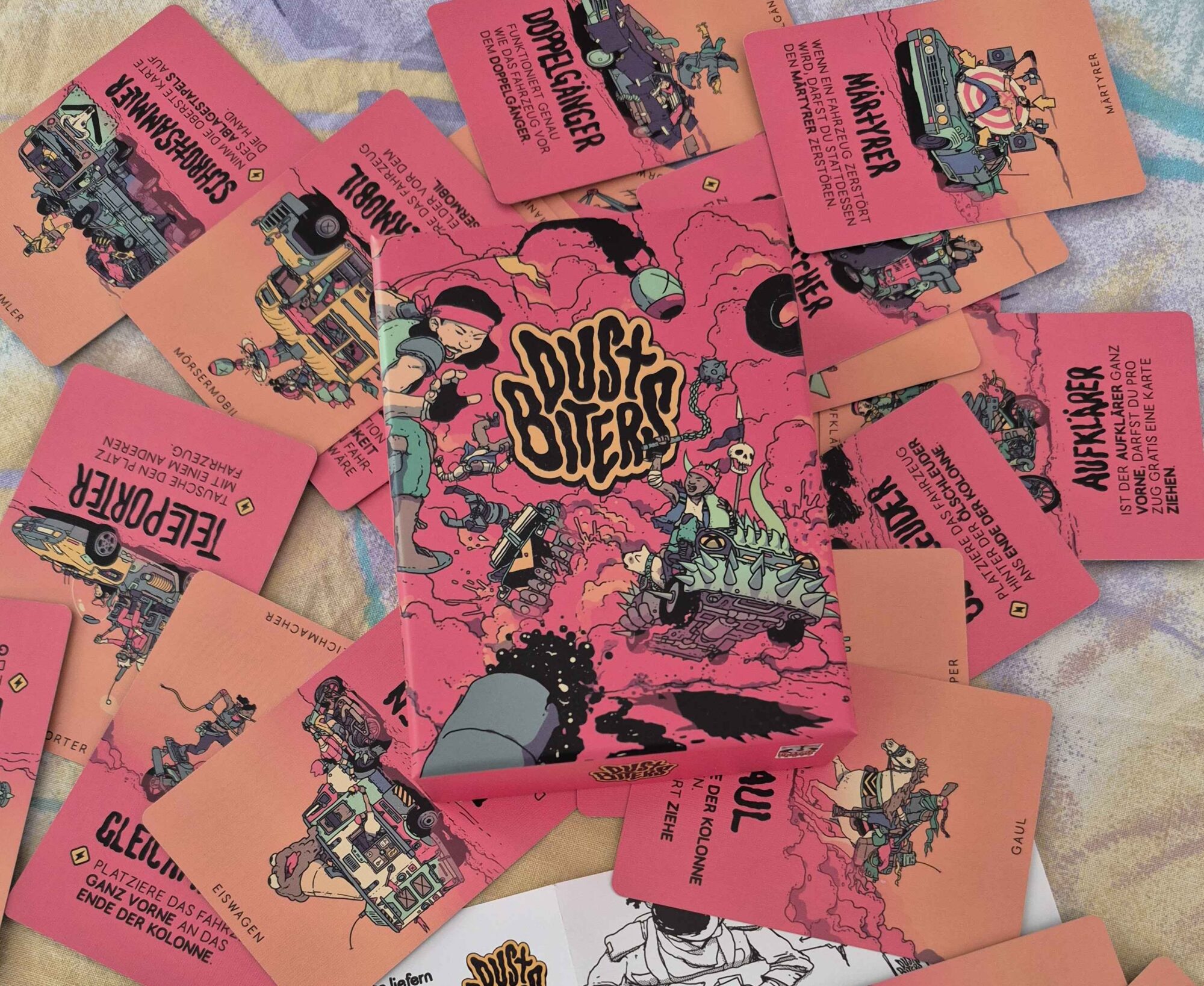 Dust Biters ist ein zwei-Spieler Kartenspiel von King Racoon Games, mit einer Spielzeit im Bereich von 15 Minuten, inklusive Regelerklärung. Die Spieler übernehmen dabei die Fahrzeuge eines Convoys, der vor einem alles vernichtenden Staubsturm flieht. Da sie dabei widerstrebenden Gangs entstammen, versuchen sie alles um die Gegner zurück zu werfen, nur um sich die entscheidenden Meter Vorsprung zu verschaffen. Das Spiel, dass sich deutlich an der Welt von Mad-Max orientiert, bedient sich dabei einer stilisierten, gut erkennbaren Comicgrafik, die der guten Lesbarkeit der Karten hilft.