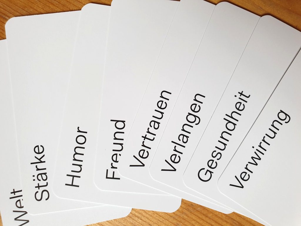 Farben ist nicht nur Titel, sondern auch Inhalt. Denn alle SpielerInnen erhalten ein Set aus verschiedenen Farbkarten auf die Hand. In der Tischmitte liegen 10 zufällig gezogene Wortkarten. Jetzt muss jeder dem aktuellen Wort eine seiner Farbkarten zuordnen und dazu eine Geschichte erzählen. Natürlich mit einer passenden Begründung, warum man nun diese oder jene Farbe gewählt hat. Sind alle 10 Wortkarten mit Farben bestückt , kommt es zur Punkterunde. Jetzt müssen die MitspielerInnen versuchen sich daran zu erinnern, wer welche Farbkarte gewählt hat. Die dazu erzählten Geschichten sollen helfen, sich daran zu erinnern. Je nach Spieleranzahl muss jede Spielerin 2 bis 3 Stapel auflösen. Wem das am Besten gelingt, der gewinnt.