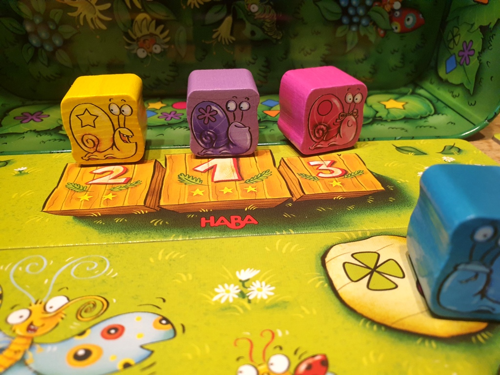 Die schnellsten Schnecken werden auf die Plätze 1-3 des Podests gestellt und gehen in die nun anschließende Wertung mit ein. Ist auf der Karte des Kindes eine Schnecke auf dem ersten Platz, gibt es drei Punkte, auf dem zweiten Platz zwei und auf dem dritten Platz einen Punkt. Wer die meisten Punkte zusammenzählen konnte, gewinnt das Spiel.