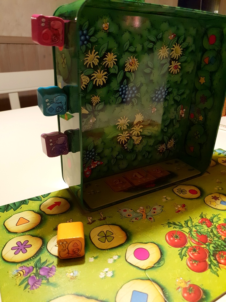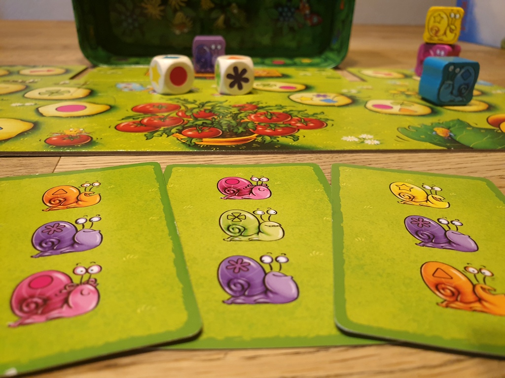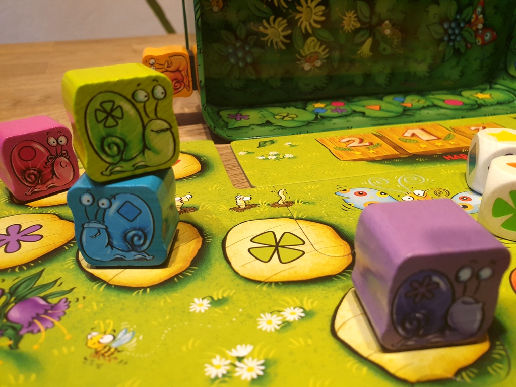 Um die Schnecken vorwärts zu bewegen, werden zwei Würfel geworfen. Die Würfel zeigen farbige Symbole an, die auch jeweils auf den farbigen Schnecken und dem Spielplan abgebildet sind. Ein Würfel darf sich nun ausgesucht werden und die passende Schnecke wird auf das nächste freie Feld mit dem Symbol des anderen Würfels gestellt. Steht eine Schnecke im Weg, zählt das auf ihr abgebildete Symbol übrigens auch mit – es kann also sein, dass eine Schnecke auf die andere gestellt werden darf und die untere somit blockiert ist. Zum Spielplan gehört auch die Metalldose, an der die Schnecken durch ihre Magnete herauf und herunter bewegt werden können.