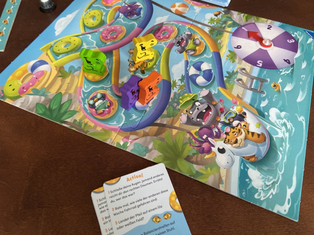 Wer kennt es nicht, das alte Spiel mit dem Nilpferd in der Badewanne auf der Schachtel, das in den 90ern so viel gespielt wurde. Jetzt gibt es eine Kindervariante dieses Klassikers mit Pantomime, Zeichnen und Wissensfragen. Wir rutschen auf dem Spielplan eine Wasserrutsche herunter, keine Achterbahn, aber Nilpferde gibt es immer noch. Ob das für den Kinderspielenachmittag geeignet ist?