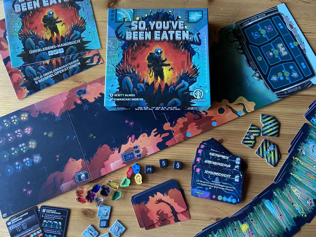 So you´ve been eaten ist ein thematisch sehr ungewöhnliches Spiel für 2 Spielende gegeneinander. Die Gestaltung trägt viel zum Spielerlebnis bei. Der Ablauf gibt einem tatsächlich das Gefühl, gegen den anderen anzukämpfen. Es gibt eine lebhafte Interaktion am Tisch. Trotzdem macht auch eine Solopartie Spaß. Man kommt gut rein und kann dann auch flott spielen. Das schlafende Ungeheuer lässt sich leicht steuern. Bei vielen gespielten Partien hätte ich gerne mehr Abwechslung in den taktischen Möglichkeiten gehabt.