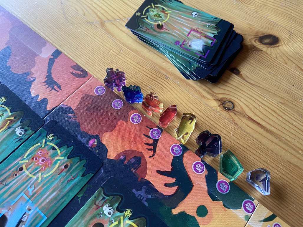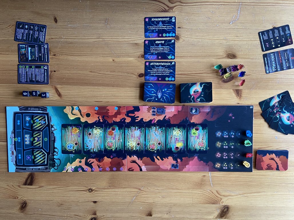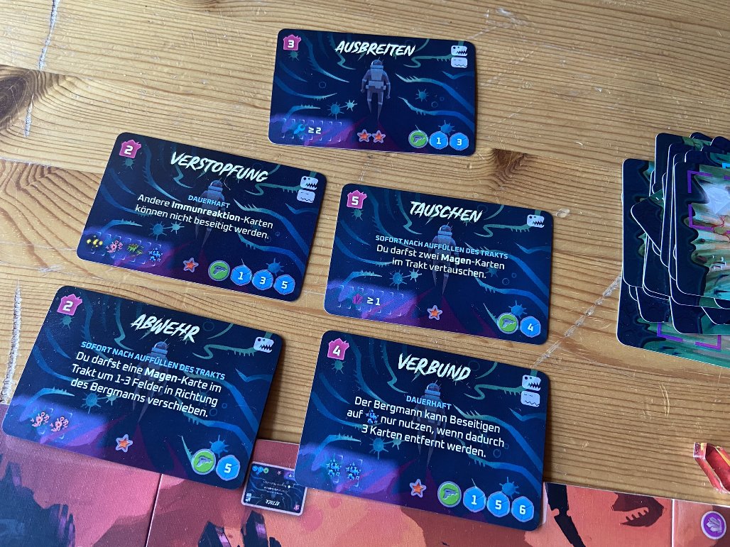 Spiele ich das Biest reagiere ich auf die Aktionen des Menschen. Zunächst fülle ich den Magentrakt mit meinen Handkarten wieder auf, so habe ich Einfluss darauf, welche Bakterien nebeneinanderliegen und wann bzw. wie viele Kristalle ins Spiel kommen. Kristalle sind für das Biest Energie. Je mehr ausliegen um so komplexere, bzw. mehr Immunreaktionen kann ich aktivieren. Anschließend wähle ich eine Immunreaktion und lege sie verdeckt ab. Mal sehen ob ich das Kitzeln im Magen damit platt machen kann.