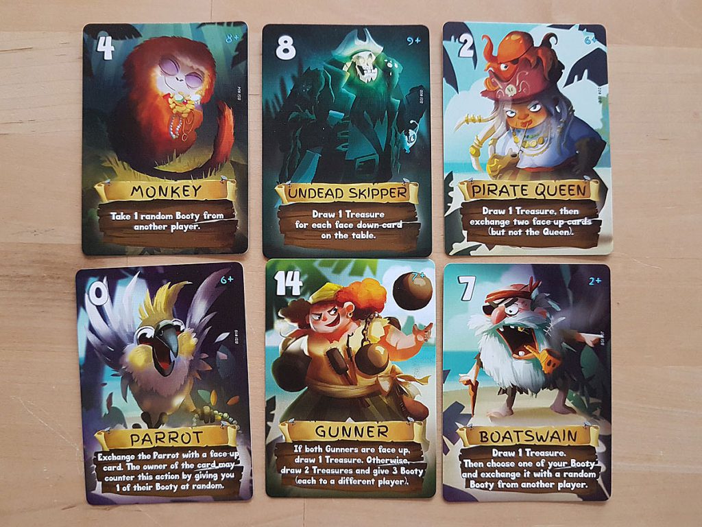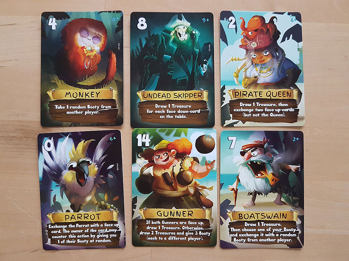 Dann beginnt eine Runde. Und das bedeutet, jeder Spieler wählt eine seiner Handkarten und legt sie verdeckt auf den Tisch. Haben das alle, werden die Karten umgedreht und in aufsteigender Folge abgearbeitet. Jede Karte stellt einen Charakter der Schiffscrew dar und hat eine Anweisung auf der Karte. Diese wird befolgt. Wenn alle Karten abgearbeitet sind, nehmen die Spieler die Karte vor sich wieder zurück, das muss nicht die gleiche sein, die ausgespielt wurde. Und schon beginnt die zweite Runde. Das geht solange, bis einer der Spieler sieben Schatzkarten angesammelt hat. Gewinner ist schießlich der Spieler, der auf seinen Schatzkarten die meisten Münzen hat.