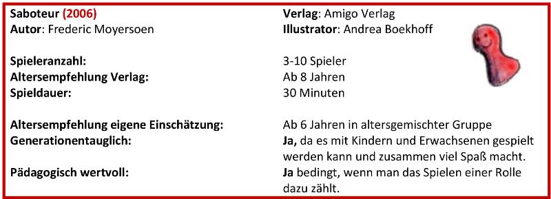 Saboteur ist ein Kartenspiel, das auf ein hohes Maß an Interaktion setzt und durch die gegenseitigen Verdächtigungen einiges an Spannung mit sich bringt. Die Regeln und auch der Spielablauf sind dabei sehr einfach gehalten, so dass dieses Spiel gerade in altersgemischten Gruppen zum Einsatz kommen könnte. Amigo empfiehlt Saboteur ab 8 Jahren, wir haben aber bereits Kinder in der Gruppe, die mit 6 Jahren mitspielen konnten und es den Erwachsenen dabei trotzdem nicht zu „leicht“ wurde.